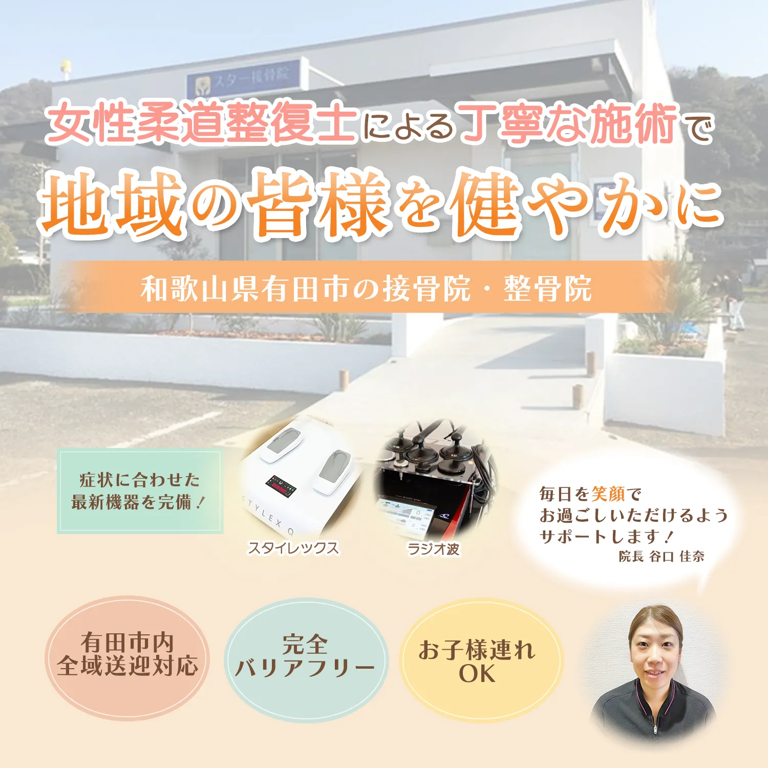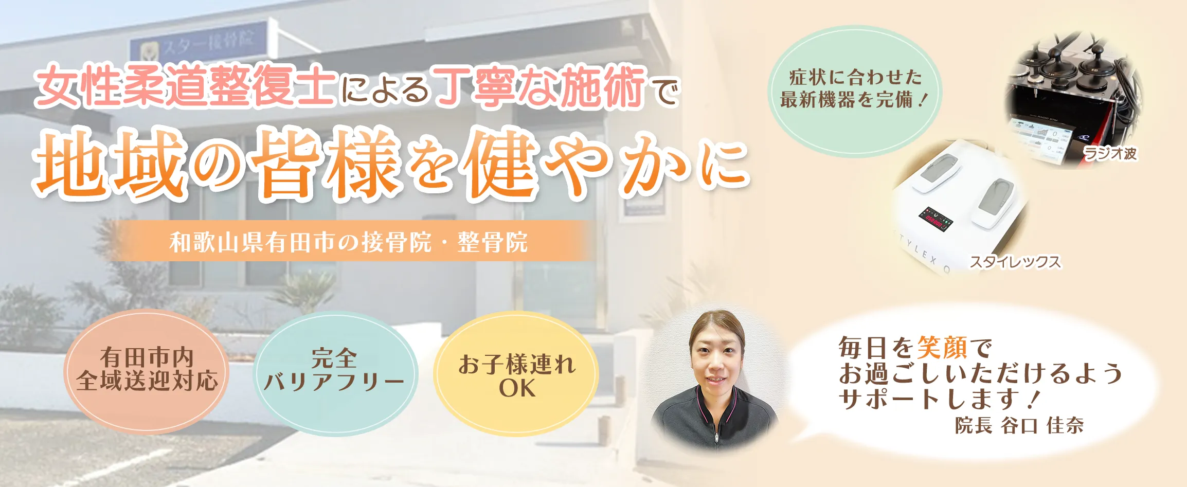 女性の柔道整復師ならではの「気配り・心配りのできる接骨院」を目指し、女性お一人でも通っていただきやすい環境を整えております。